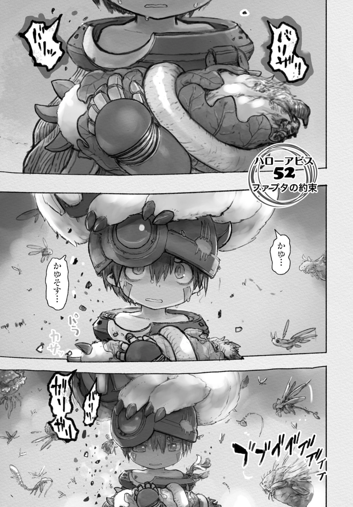 Reg is carrying the body parts Faputa ripped off herself while she is resting on his head. A short exchange between the two follows, in which Faputa requests to be patted on the head by Reg, followed shortly by noises of creatures attracted by the smell of Faputa's blood, and they quickly hurry to the entrance of the village.