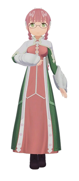 Mio wears glasses and has very long pink hair tied in an intricate braid. She wears what is presumably the pharmacists' uniform from the caravan fleet, a long red and green dress, and a short white shawl.[2]